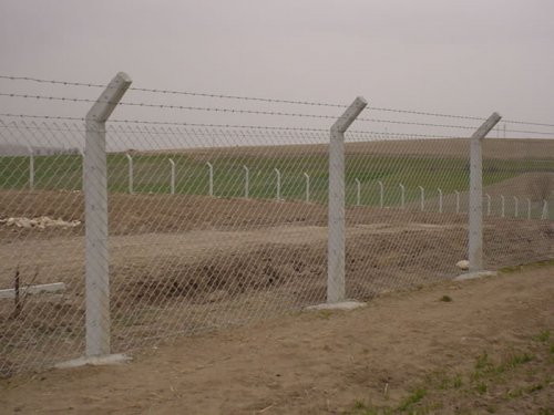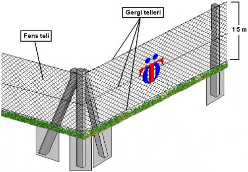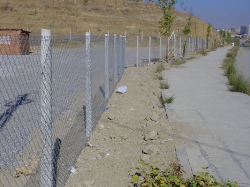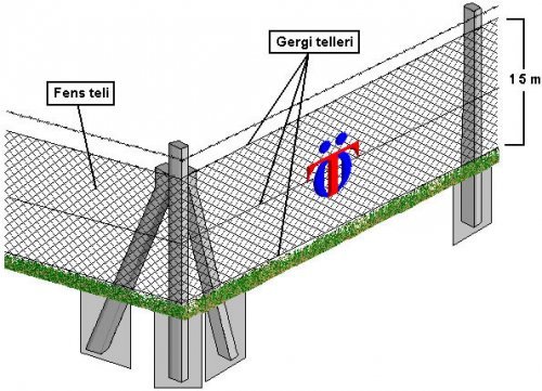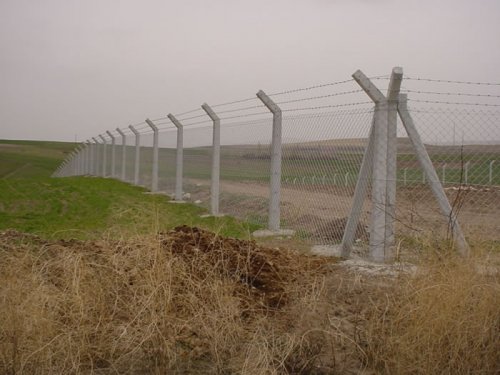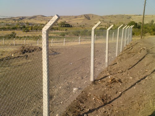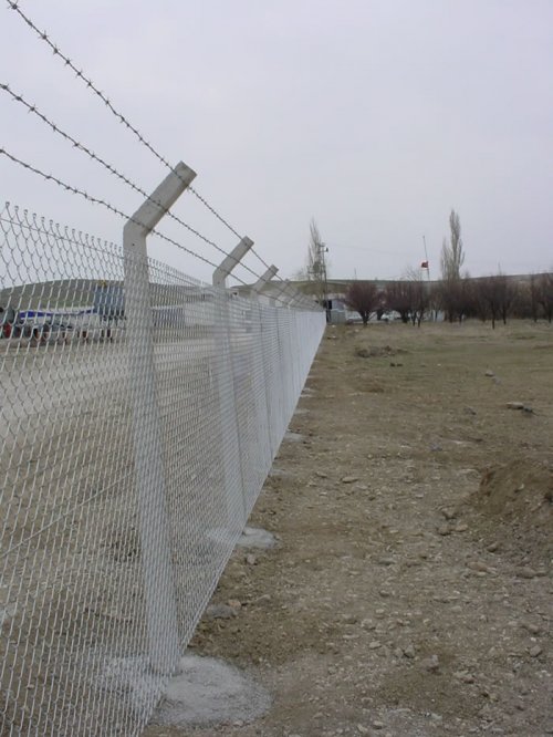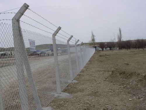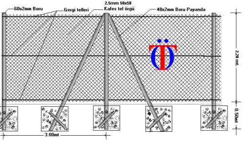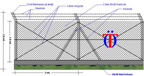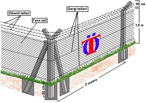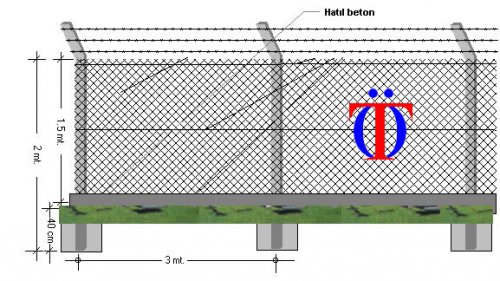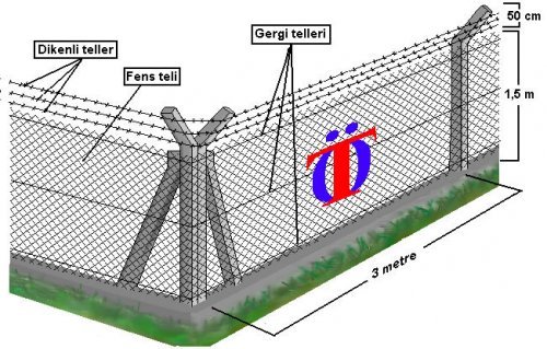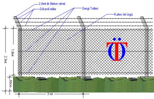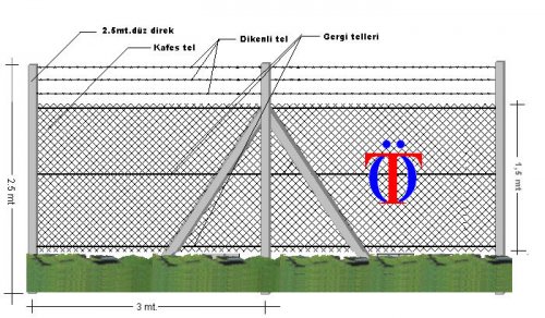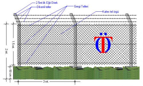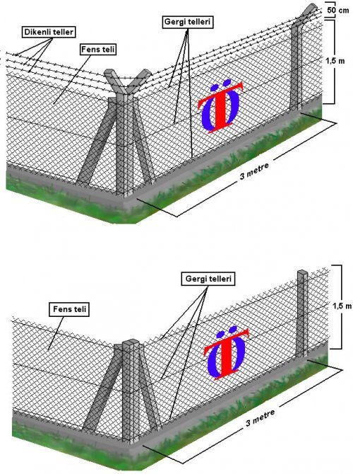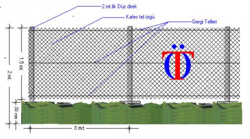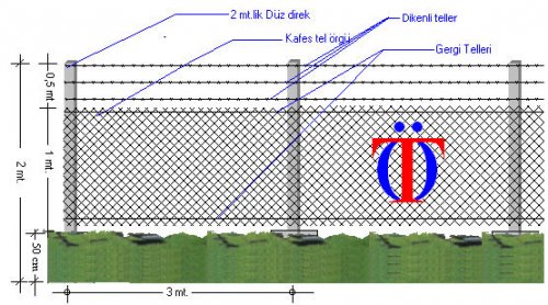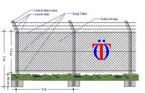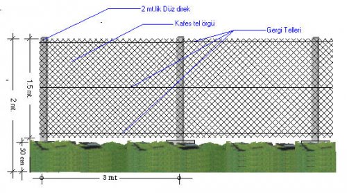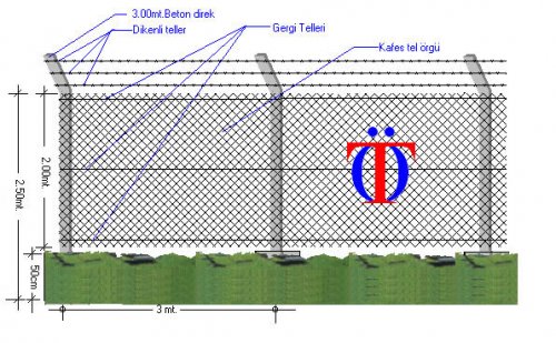 ,50 cm kısım betonlanır 150 cm kafes tel örgü Eğri kısmına 3 sıra dikenli tel çekilir